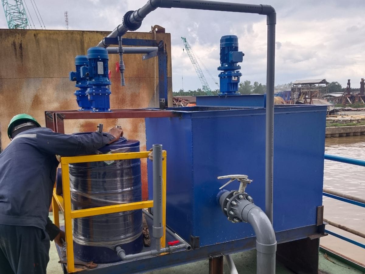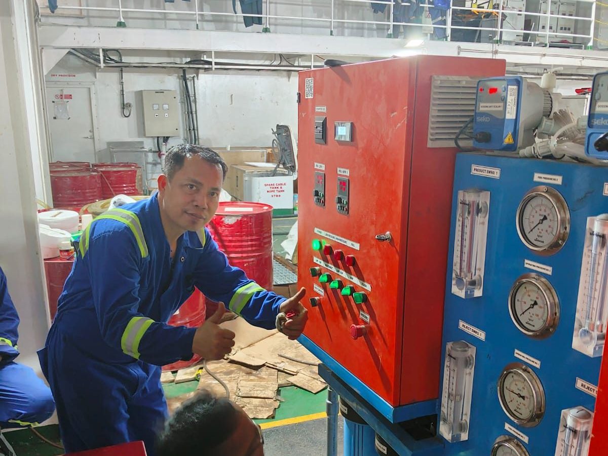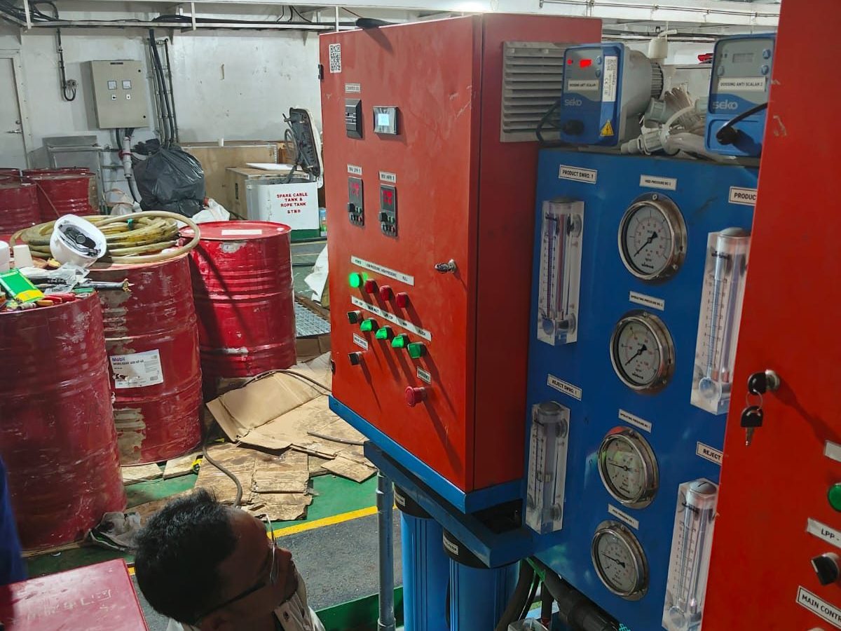 Instalasi sistem desalinasi di kapal Prima Nusantara. Sistem compact dan efisien untuk memenuhi kebutuhan air tawar seluruh awak kapal selama berlayar.